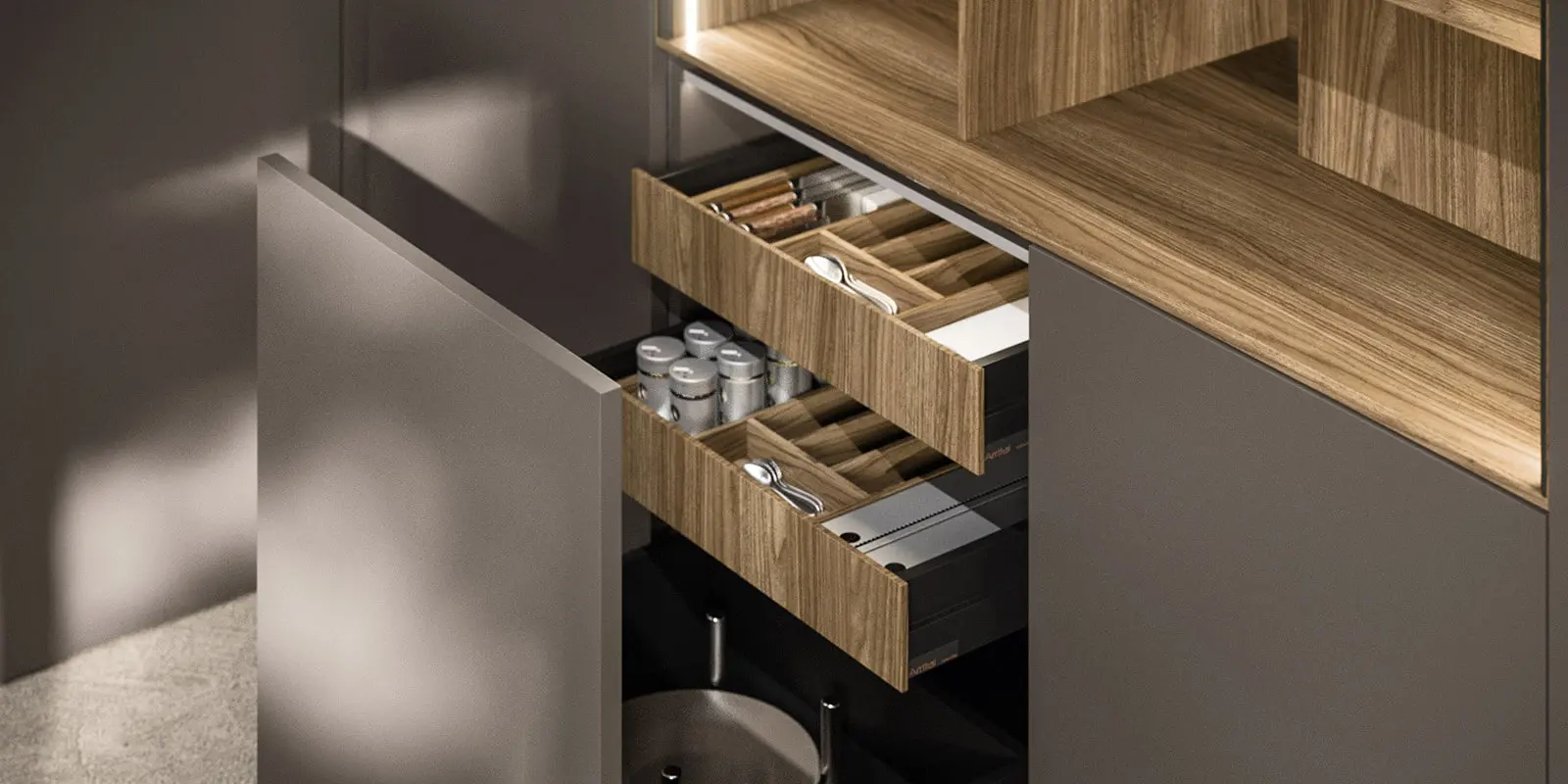 L'excel·lència d'Arrital es manifesta en els seus acabats. Des de fustes texturitzades termotractades fins als innovadors Fenix NTM® anti-empremtes, cada superfície està pensada per resistir el pas del temps mantenint la seva bellesa intacta. La integració de sistemes d'il·luminació LED i solucions d'emmagatzematge ergonòmiques eleven l'experiència culinària a un nou nivell.