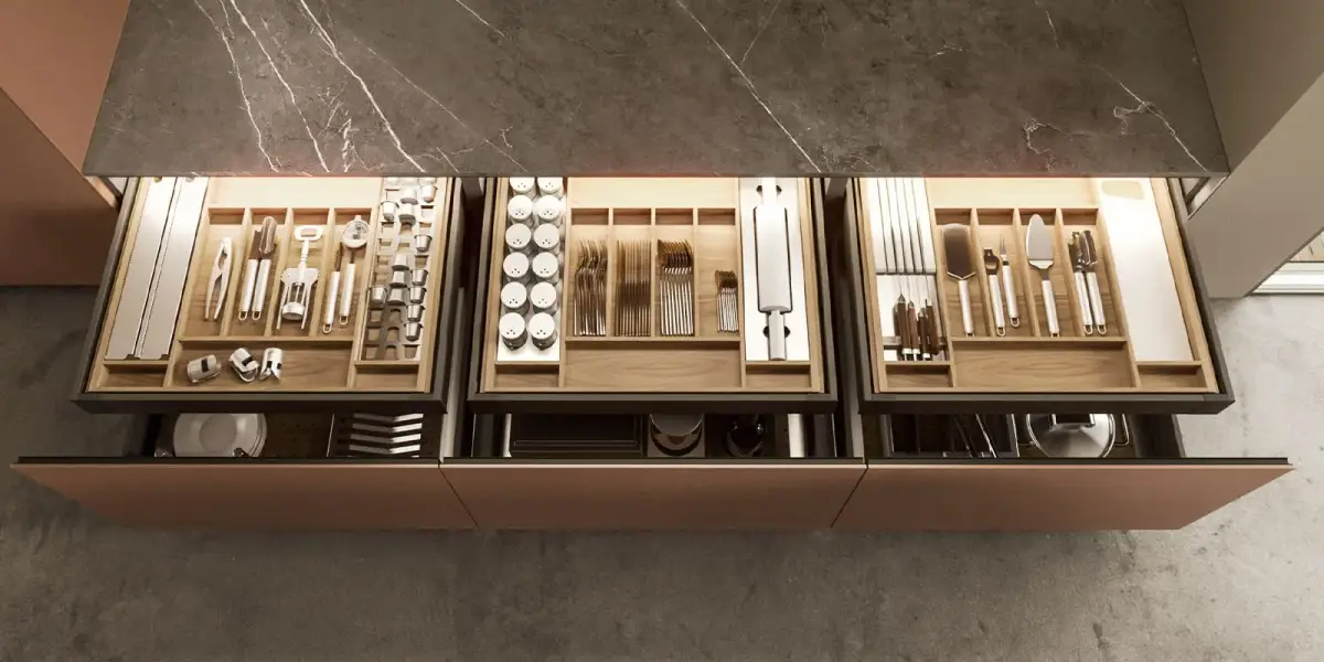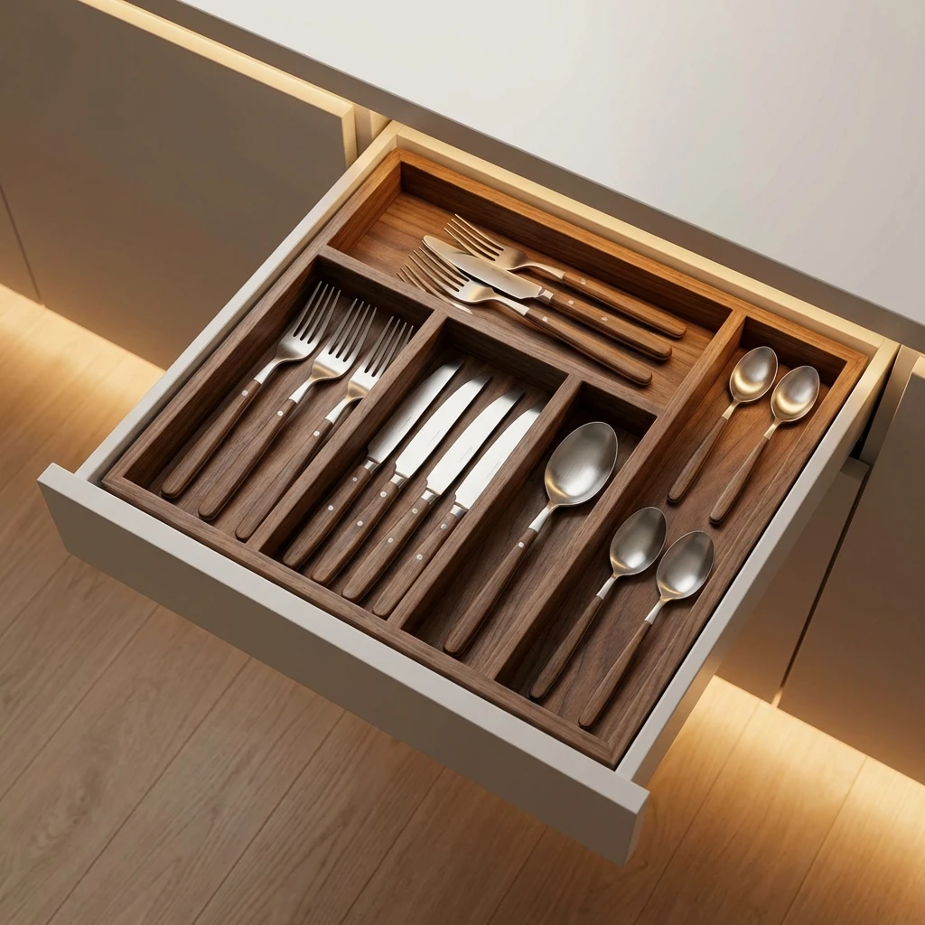 Olvídate del caos en los cajones de cubiertos. Nuestros sistemas de organización en madera de nogal o roble permiten asignar un lugar específico para cada utensilio. Desde separadores modulares para cubiertos hasta soportes ajustables para platos, cada accesorio está diseñado para maximizar el espacio y proteger tu vajilla.