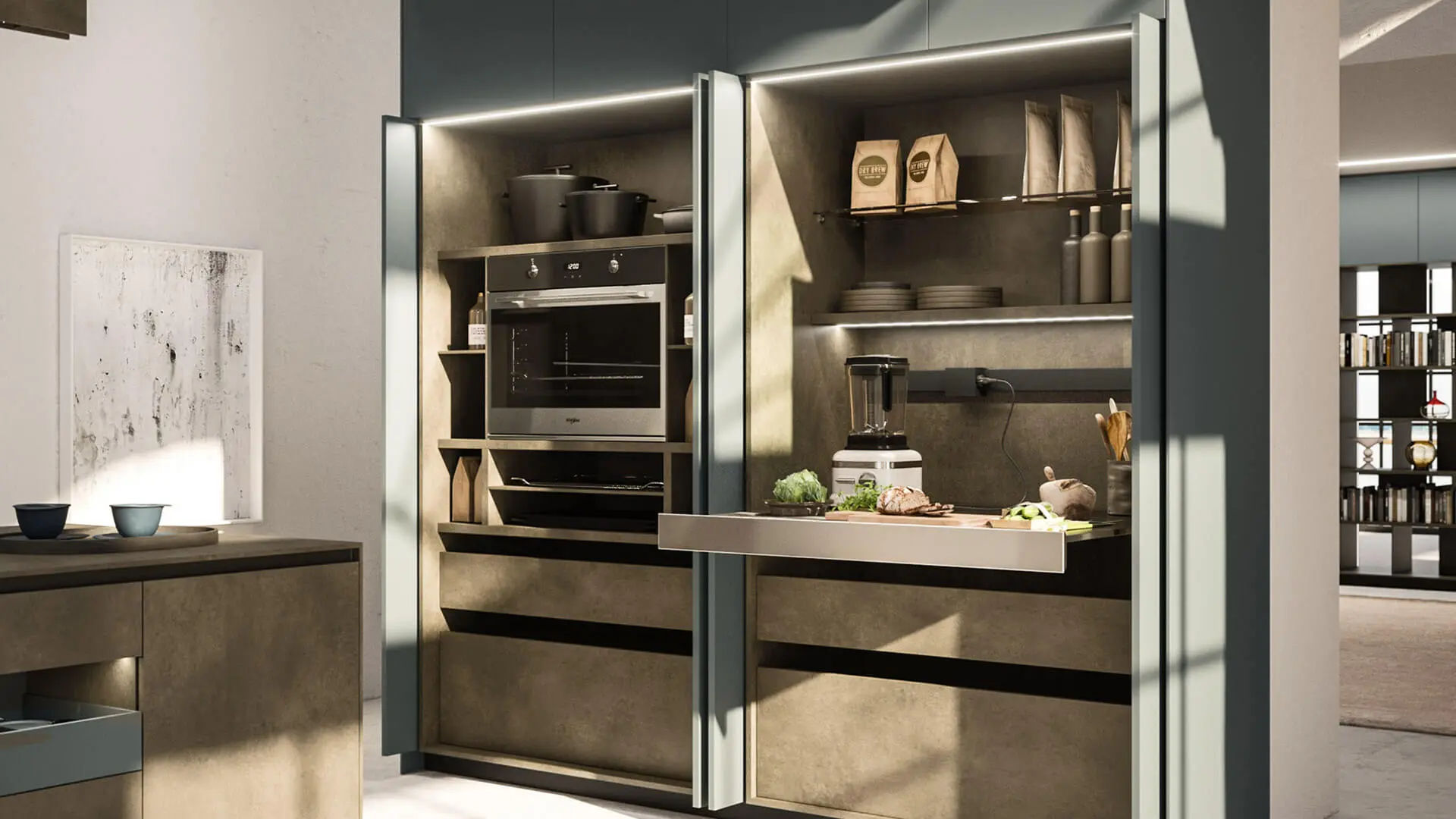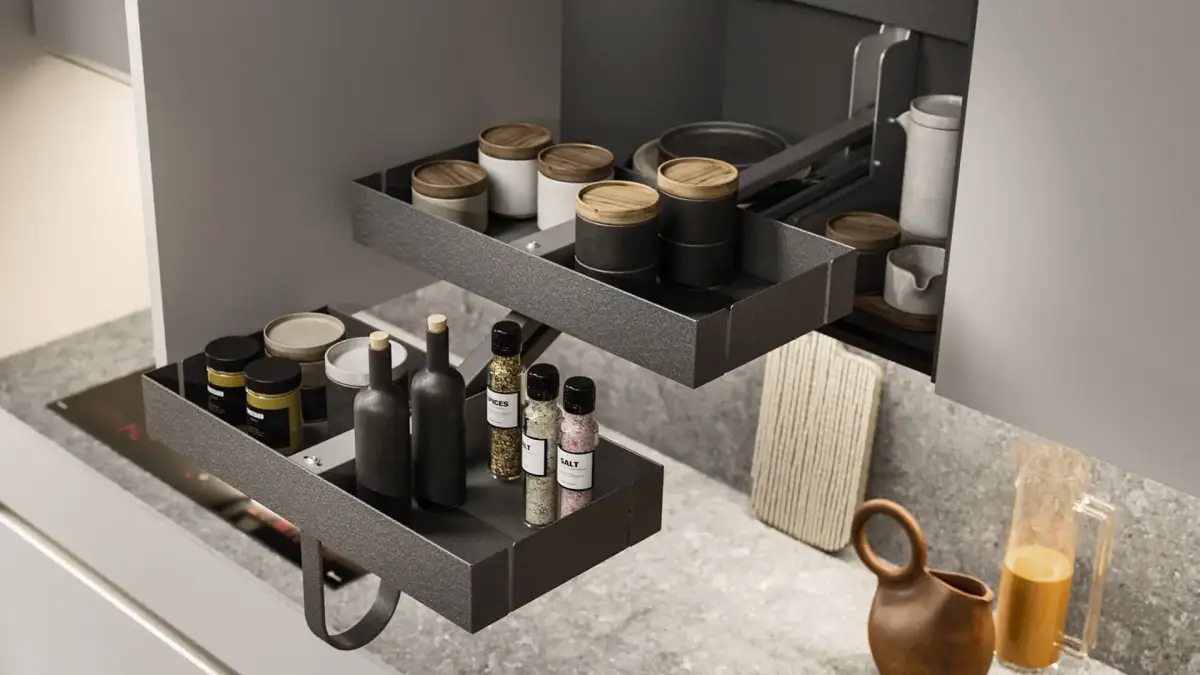 Aprovechar cada centímetro es nuestra especialidad. Los sistemas de columnas extraíbles para despensas transforman armarios profundos en espacios accesibles y visibiles al 100%. Además, nuestros mecanismos 'Magic Corner' para muebles esquineros hacen que acceder a las ollas y sartenes más escondidas sea un movimiento suave y sin esfuerzo. La gestión de residuos también se eleva con nuestros sistemas de reciclaje integrados bajo el fregadero, higiénicos y discretos.