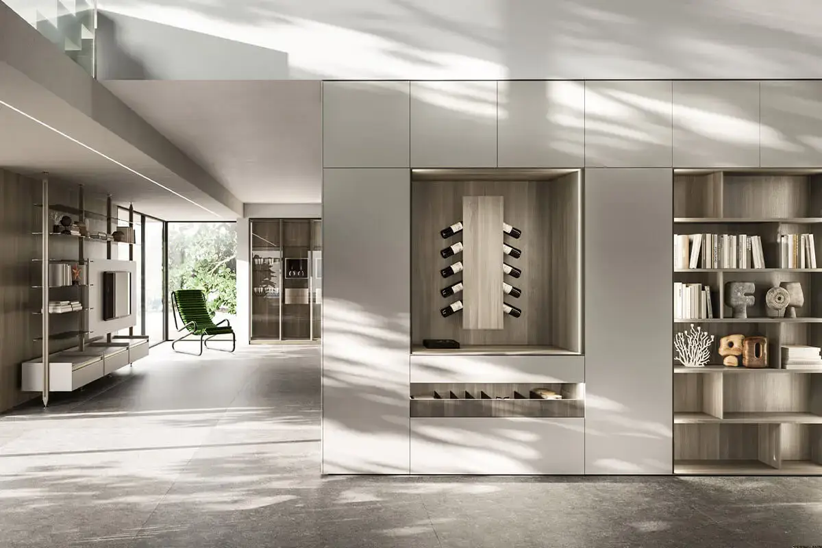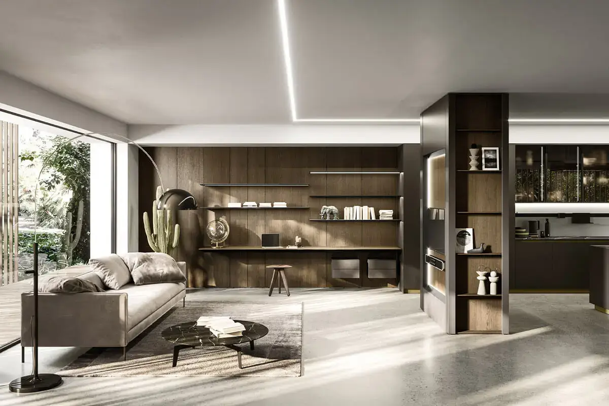 Una de las grandes ventajas de abrir la cocina al salón es la continuidad visual. Los sistemas de Arrital permiten utilizar los mismos acabados en muebles de cocina y en elementos del salón, como estanterías o mesas auxiliares. Esto crea una armonía perfecta que amplía visualmente el espacio.
