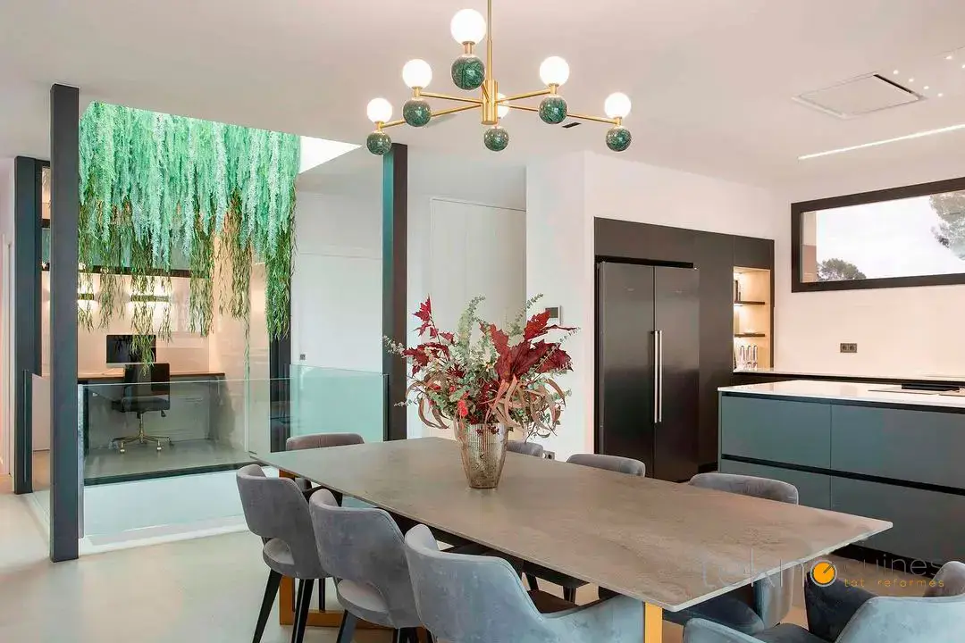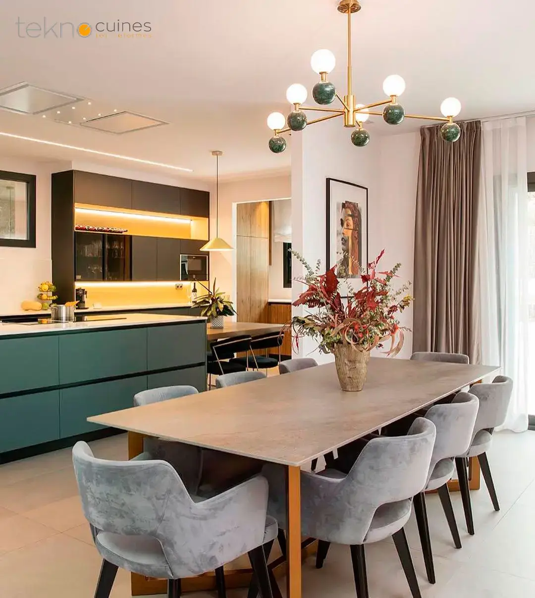 Al compartir espacio con el salón se pensó en unir la mesa a la zona de isla, para ello se utilizó un sobre de madera natural en color olmo moka sabbiato con el soporte de una pata en cristal, dándole la sensación de flotar.