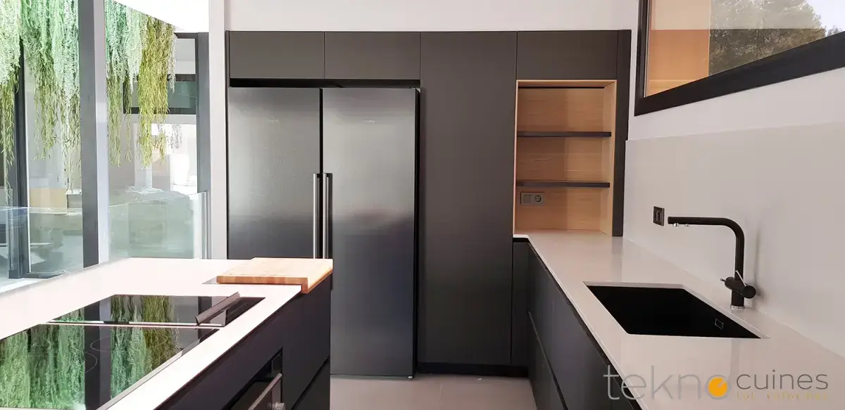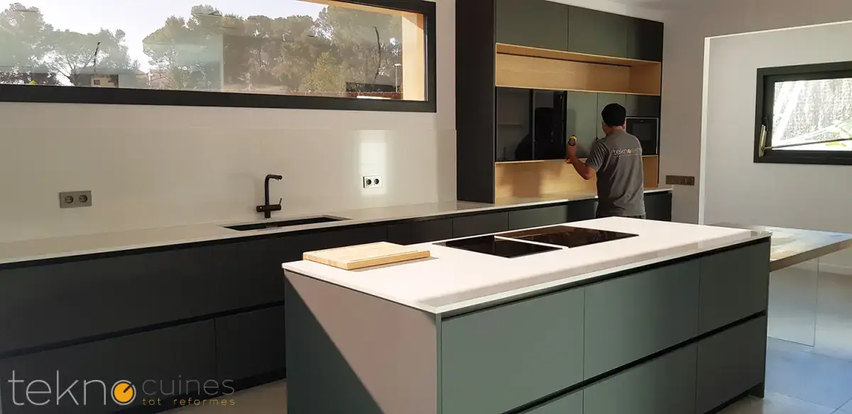 La cocina se sitúa en una vivienda en construcción en Sant Quirze del Vallès (Barcelona), el diseño de toda la vivienda ha sido mimado hasta el último detalle, y como la cocina no iba a ser menos la clienta se decantó por un mobiliario Arrital en Fenix* con colores Verde Comodoro y Doha Piombo, utilizando un fondo chapado en roble para los estantes abiertos.