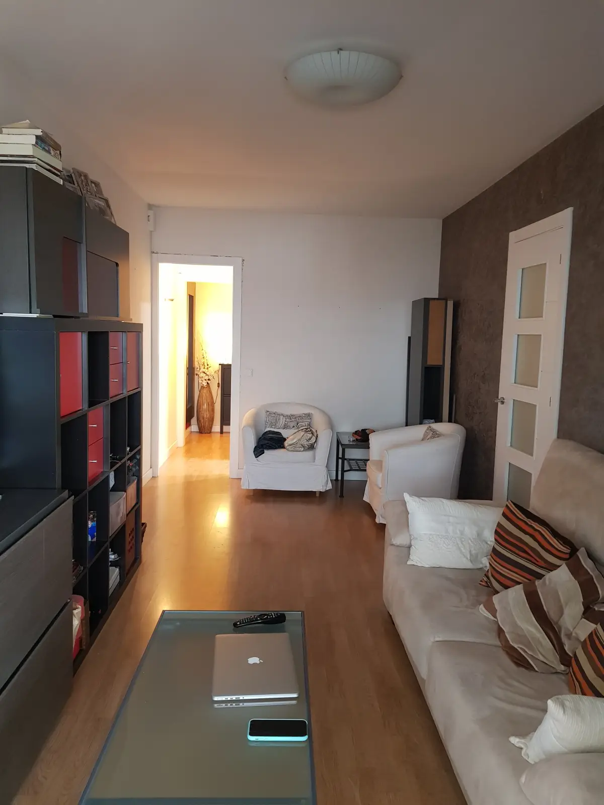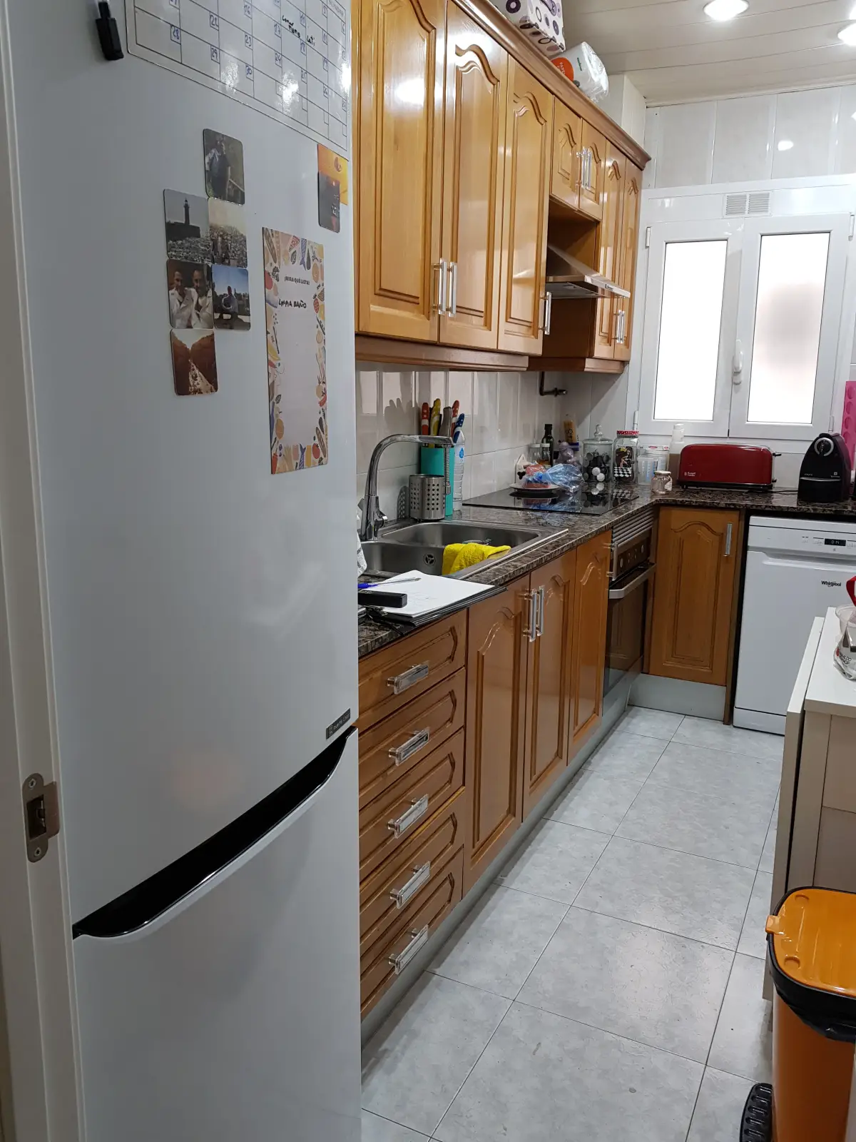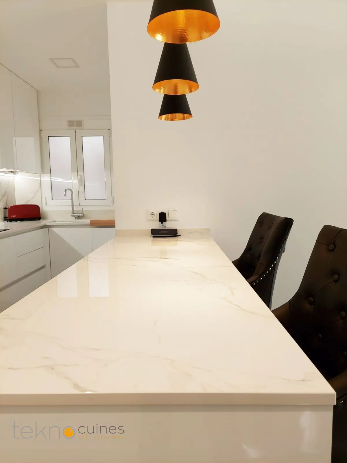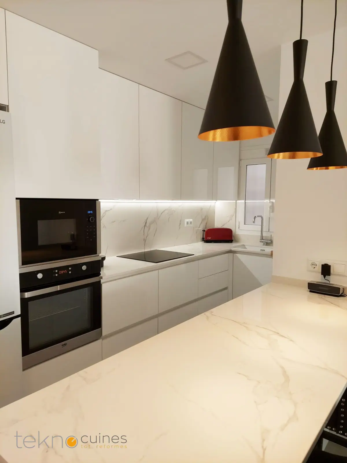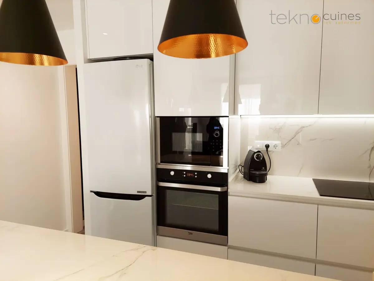 Reforma en una vivienda de Hospitalet de Llobregat, abriendo cocina al salón y creando una península con barra. Mobiliario de cocina Arrital, encimeras porcelánicas de Dekton.