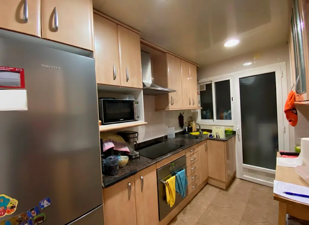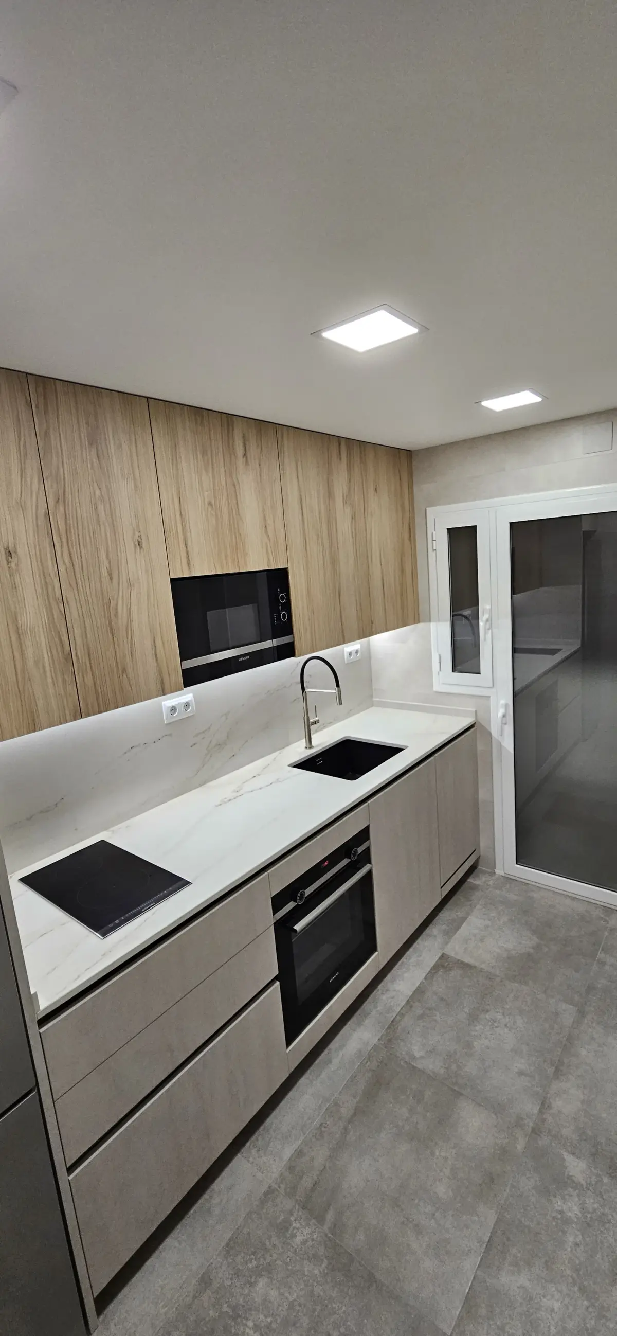 Reforma de cocina en vivienda de Hospitalet de Llobregat. Se redujo el tamaño de la ventana para poder hacer llegar los armarios altos hasta el fondo. Mobiliario de cocina Arrital color Salina con detalle de madera en color Rovere Columbia. Encimeras porcelánicas en Dekton modelo Rem.