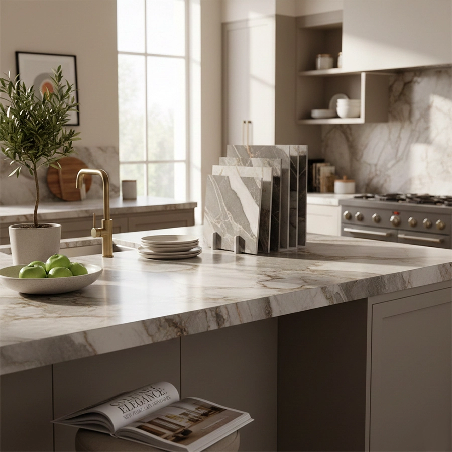Trabajamos con los principales fabricantes de superficies de cuarzo, porcelánicos y piedra natural. Te asesoramos para elegir el material que mejor se ajuste a tus necesidades de resistencia, mantenimiento y diseño.